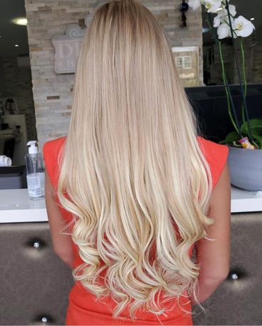Micro Weft Hair Extensions involves using a weft of hair which is a long seam that the hair is attached to at the top (like used for clip-in extensions) and are attached to your hair with Micro Beads as seen in the image on the left. Wefts of hair come in a variety of colours, lengths up to 22 inches and styles i.e. straight, body wave, curly and different hair textures. This method is perfect for adding instant length and volume to the hair. Micro Weft are one of the more newer and quicker methods of hair extensions as a full head application only taking about 60 mins and a re adjustment only taking about 45mins